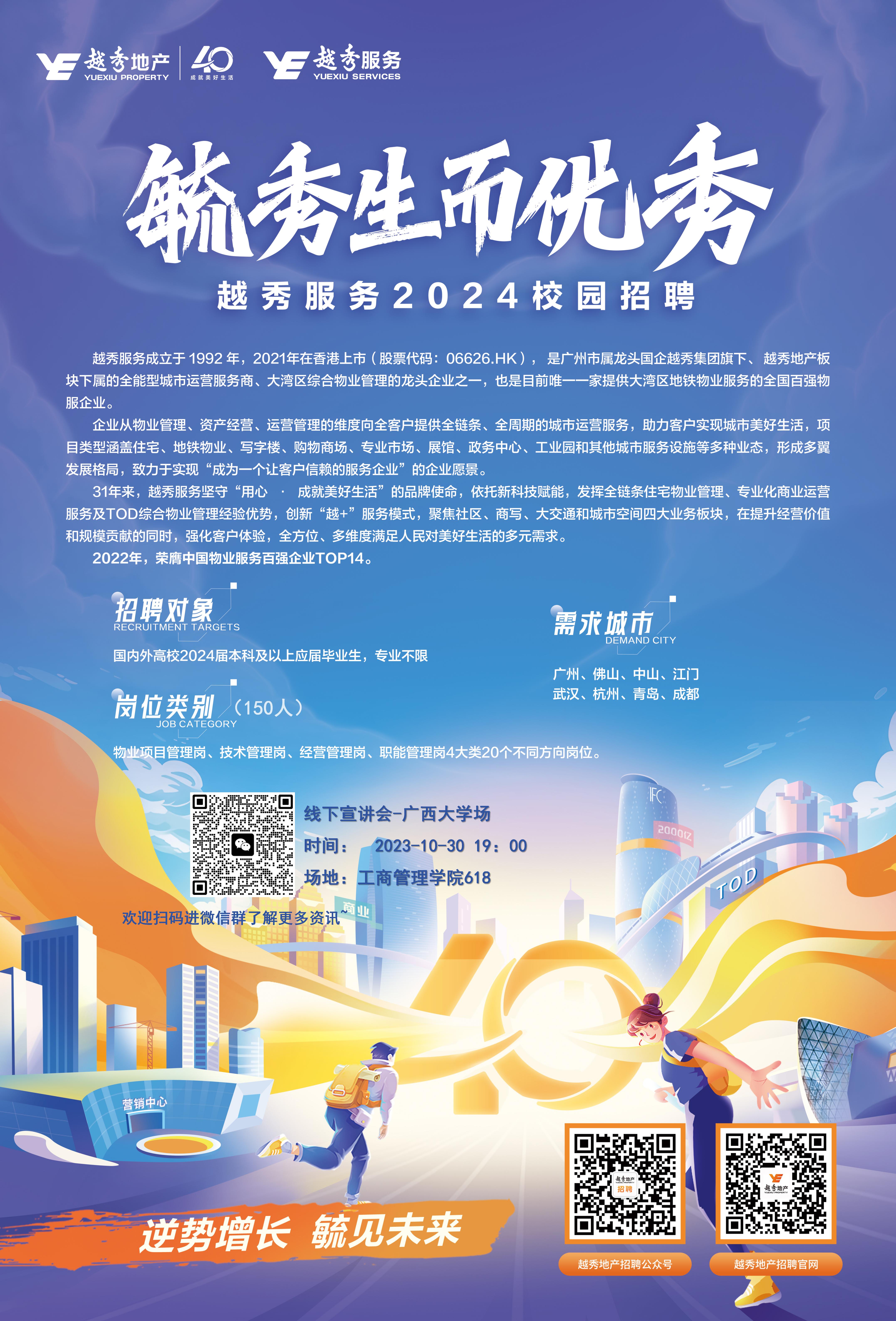 越秀服务2024年校园招聘约定你,更多信息可扫描二维码进群咨询