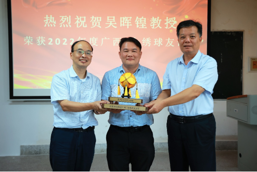 此外,会上为荣获2022年度广西“金绣球友谊奖”的吴晖锽教授颁发了学院特别定制的奖杯。学院党委副书记、纪委书记雷圆媛开展了清廉警示教育。