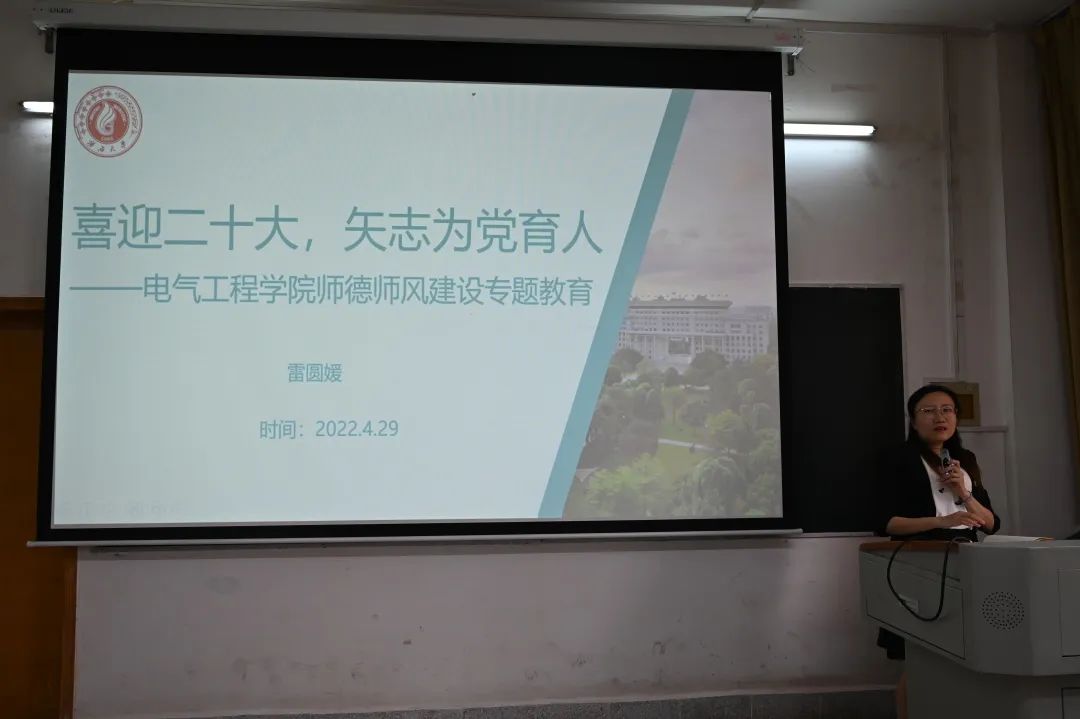 学院党委副书记、纪委书记雷圆媛以“喜迎二十大,矢志为党育人”为主题,开展“师德师风”建设专题教育。雷圆媛副书记结合习近平总书记关于“师德师风”的重要论述以及《kaiyun登录中国入口登录教师失德失范行为处理办法》,详细解读我校师德负面清单,以生动案例给全体教职工上了一次形象生动的“师德师风”教育课,引导广大教师时刻自重、自省、自警、自励,努力打造具有政治素质硬、业务能力精、育人水平高的高素质教师队伍。