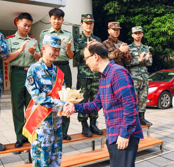 座谈会接近尾声,学院领导老师为马国富佩戴绶带并送上了鲜花,并与退伍大学生代表合影留念。祝福马国富同学在未来的道路上能够不负韶华、以梦为马;将在从军中磨练的精神和意志继续延续下去、努力奋斗,为祖国创造光明的未来。让我们向光荣退伍的马国富同学学习、致敬!