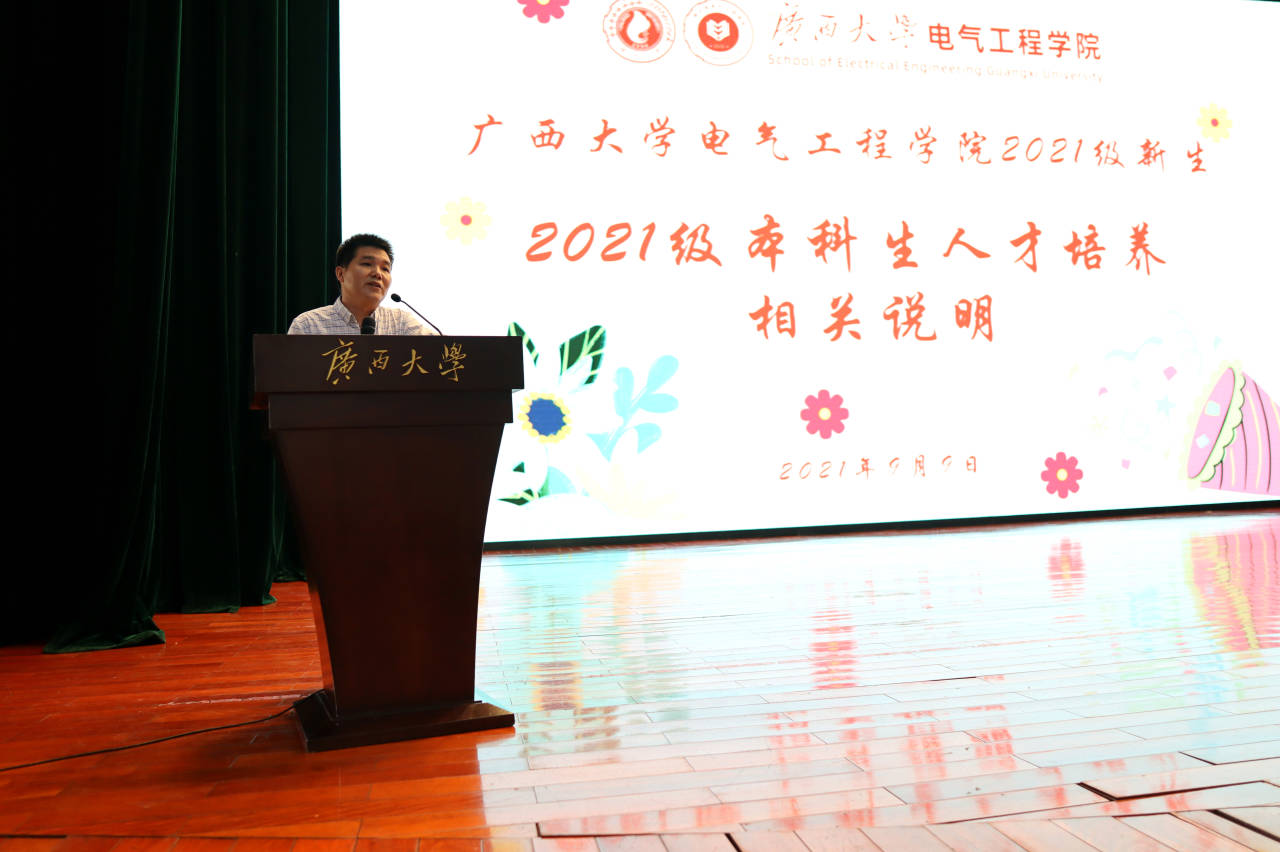 最后,副院长胡立坤老师对本科生人才培养进行了解读和宣讲,为全体新生介绍了电气专业的培养目标,并对新生学习方法与态度进行了指导。他为新生解读学院本科人才培养方案,努力在人才培养的过程中厚植优势、凝练特色,在突出特色中不断创新。建议新生结合自身专业兴趣,按照“施工图”、对照“时间表”,制定整个大学生涯的学习计划,能够在大学四年里学有所成。