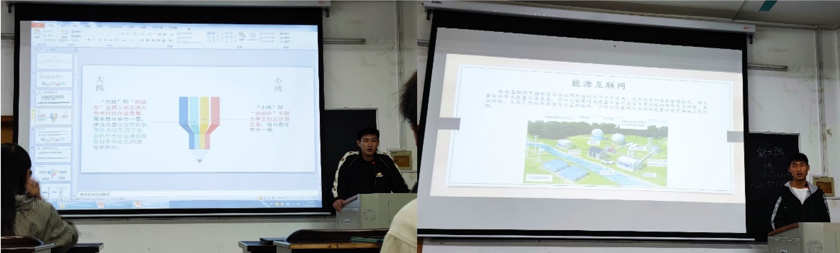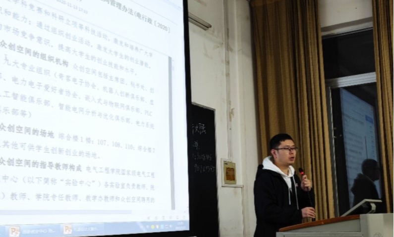 孙昕同学代表创新创业中心对“互联网+”、“挑战杯”等竞赛进行了讲解和介绍,并介绍了众创空间的创业孵化基地;姜炳旭、徐佳琪、郑静妍、陈予博、罗洪丹、莫明山、刘东端等同学分别对“全国大学生节能减排大赛”、“台达杯高校自动化设计大赛”、“学院程序设计大赛”、“西门子杯中国智能制造挑战赛”、“全国大学生物联网竞赛”、“学院工程软件设计大赛”、“学院电源设计大赛竞赛”、“学院潮流计算竞赛”等各类“双创”大赛进行了宣讲动员和经验分享。通过分享为同学们展示了创新创业赛事的多元可能性,使同学们认识到了电气工程与自动化专业知识储备在竞赛中的重要性,加强了同学们的创新精神和创业意识。