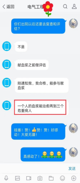 2月22日,复检正常之后,医院告诉张哲可以做捐献血浆前的综合评估(贡献血浆对捐献者的血液要求较高)了。次日上午,好消息再来,各项检测指标均符合标准。他立即将这一消息分享给了学院的辅导员老师。学院领导老师得知后,第一时间以学院党委的名义发去了慰问信,称赞张哲的大爱之举,并叮嘱他保重身体,期待开学相见。24日上午,张哲在湖南省岳阳市中心血站捐献了血浆。