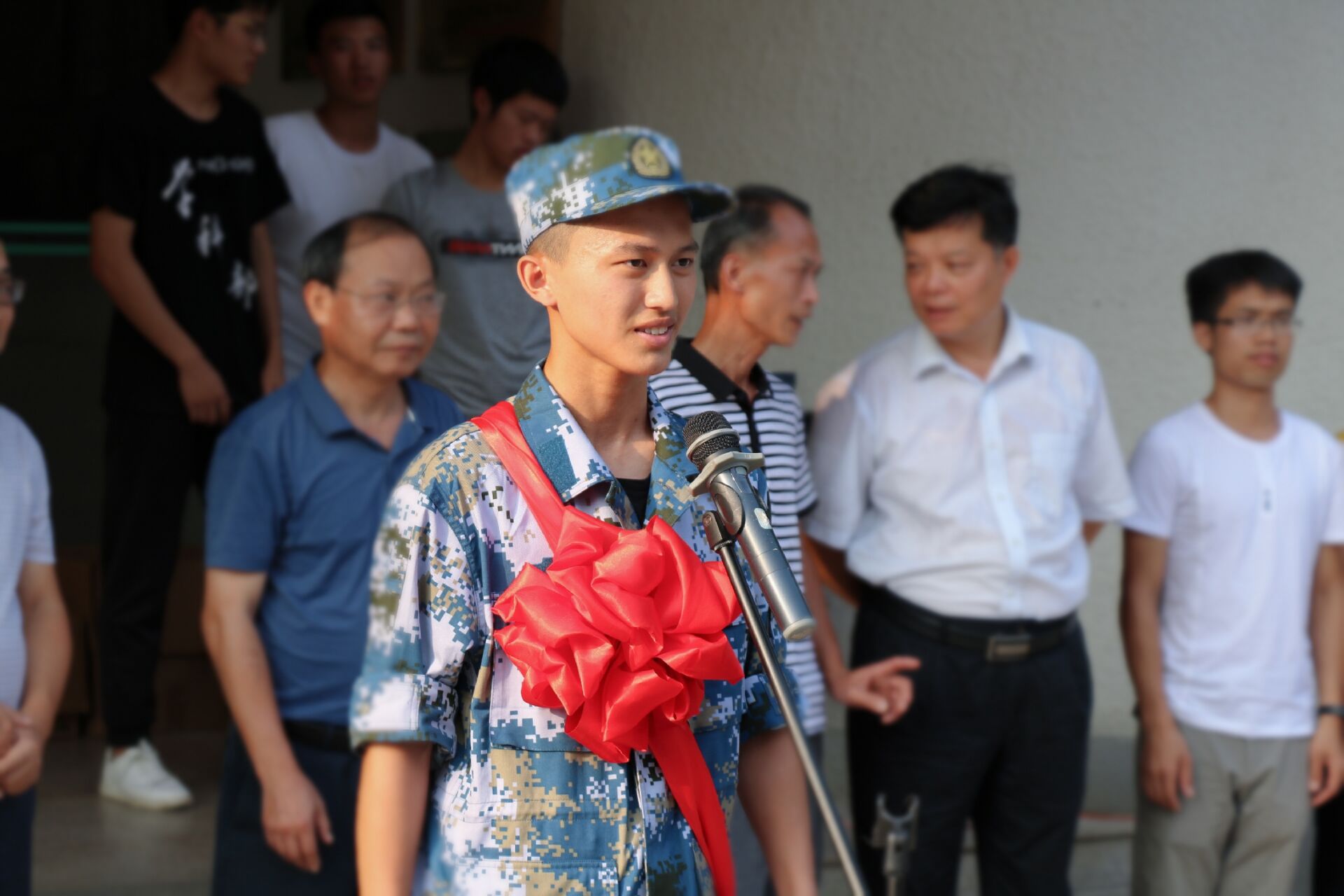 党委副书记梁志坚老师代表学院发表讲话。梁副书记对即将奔赴军营的马国富同学表示祝贺,希望马国富同学到达部队后安心服役、听从指挥、遵守纪律、刻苦训练,以优良的作风和良好的精神面貌承担起一名军人的责任;同时不忘学业,用自己的知识和技能为国防和军队现代化建设贡献自己的智慧和力量。