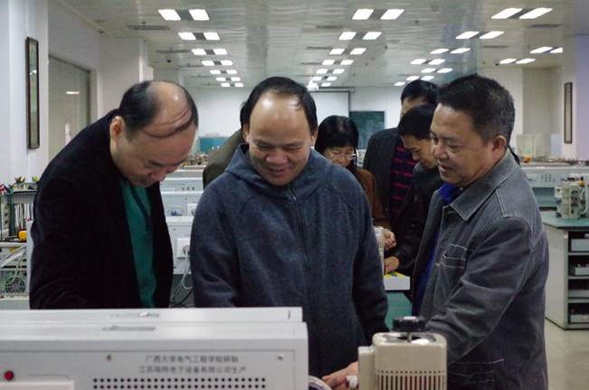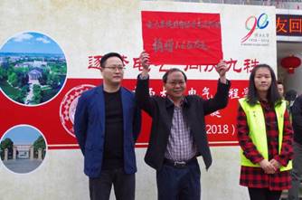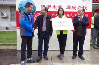 各位校友在学院正门前与老师们交流、合影,并自由参观了校园、校史馆以及校友馆。随后,众校友前往综合体育馆参加迎校90周年庆祝大会,之后于学院正门前进行校友捐赠仪式。自动化专业97级苏德新校友、电力系统及其自动化96级校友、计算机应用专业89级校友、计算机及其应用专业92级校友、广西柳州特种变压器有限公司总经理、广西柳电电气股份有限公司总经理分别上台捐赠。学院党委书记梁京章老师与院长双丰老师上台接受捐赠。此外,由学院党委书记梁京章老师与院长双丰老师分别同两位企业代表人共同完成了两间冠名实验室——“柳特变”电工技能实验室和“柳电电气”电气接线实验室的揭牌仪式。