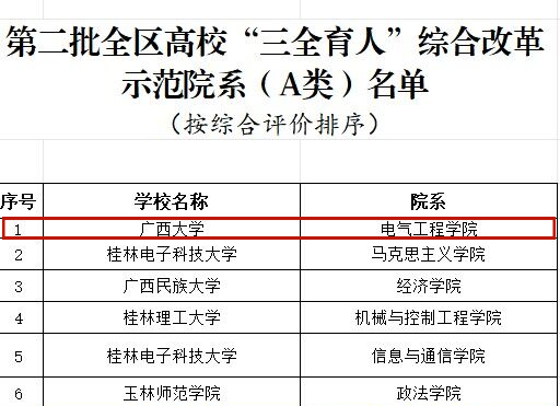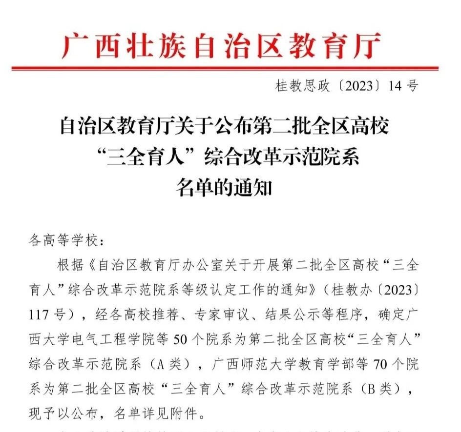 近日,广西壮族自治区教育厅发布了《关于公布第二批全区高校“三全育人”综合改革示范院系名单的通知》,kaiyun官网成功获批为A类综合改革示范院系(综合排名第1)。