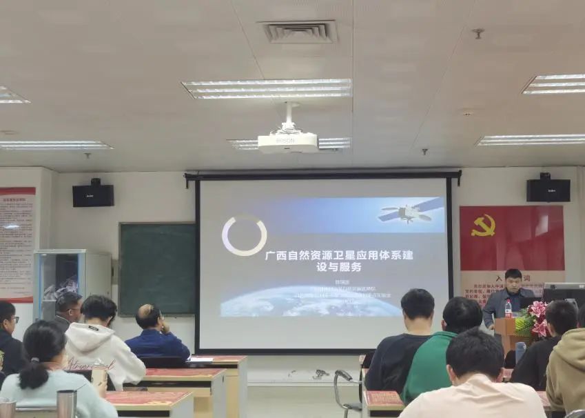 在交流互动环节,双丰老师、李畸勇老师和学生代表分别就广西自然资源卫星应用技术在地质灾害监测及其在电力行业的应用、广西自然资源卫星中心的地图数据特点及其与高德百度等地图的区别、广西自然资源卫星数据的申领使用等方面问题进行交流讨论。