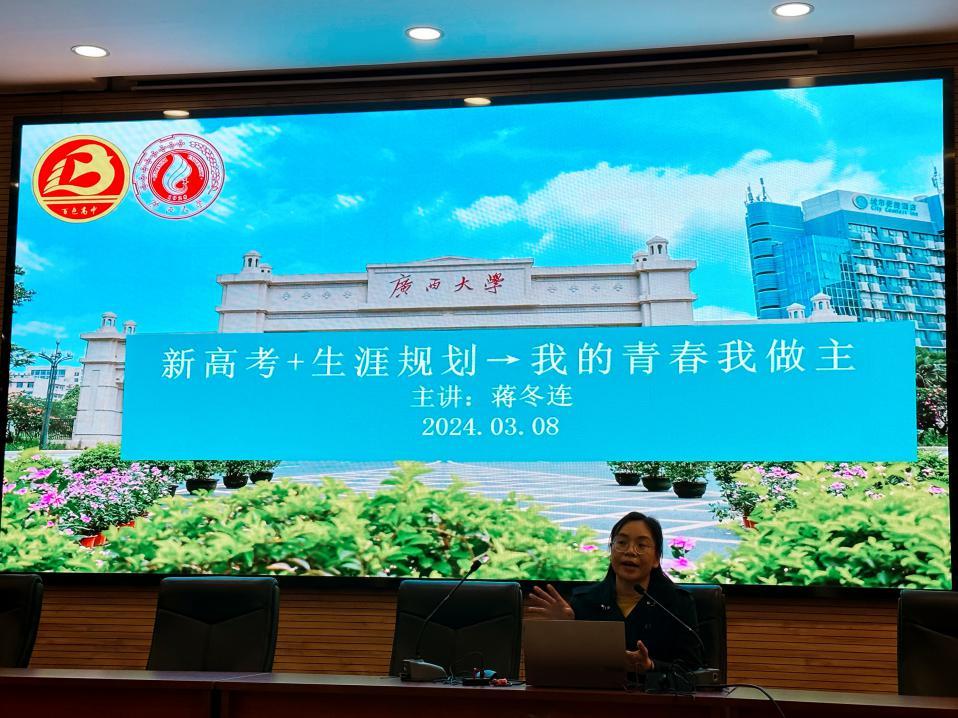 与企业的交流结束后,kaiyun官网一行在百色高中举行了职业生涯规划指导讲座。学院团委副书记蒋冬连老师作为主讲人,给百色高中2021级四百多名高三年级学生做题为《新高考+生涯规划→我的青春我做主》的讲座。她从高考综合改革概况、“生涯规划+志愿填报”的融合、我的青春如何由我做主等多方面展开宣讲,同时结合kaiyun登录中国入口登录特色和优势宣传kaiyun登录中国入口登录,受到在场学生的热烈欢迎,现场气氛活跃。