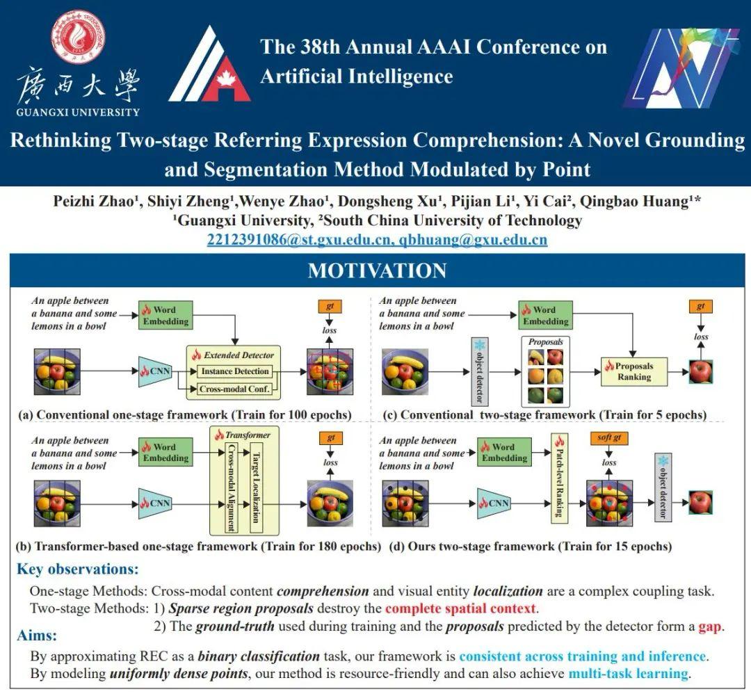 kaiyun官网控制工程专业人工智能方向2021级硕士生赵沛芝同学张贴了其论文《Rethinking Two-Stage Referring Expression Comprehension: A Novel Grounding and Segmentation Method Modulated by Point》的海报。论文针对了REC,RES任务中的一阶段、二阶段方法进行了回顾总结,提出了一种先回归中心,后回归定位、分割的方法,极大地减少了可训练参数,并且能够更快地收敛,在REC和RES榜单中占据领先。值得一提的是,这篇工作是AAAI2024中唯一一篇关于图像REC的工作。赵沛芝同学分享了论文,回答了与会师生提出的问题,并与相关学者进行了深入交流。