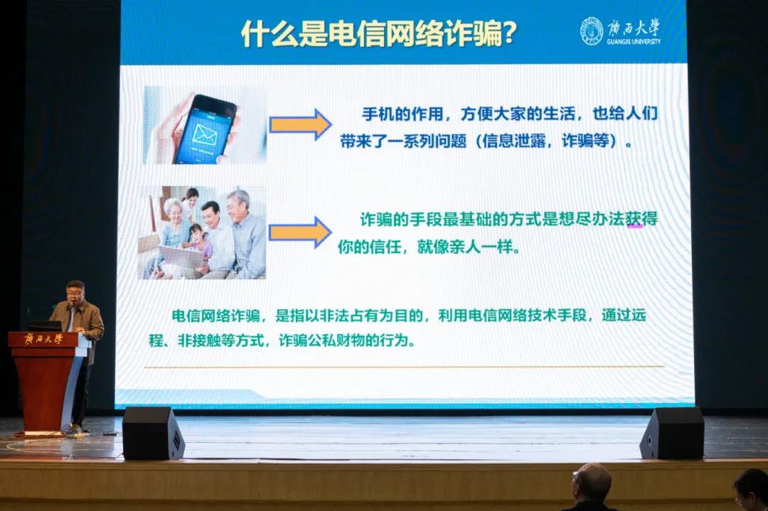 此外,本次大会邀请了kaiyun登录中国入口登录保卫处金中州老师向与会师生进行反诈安全教育。他向大家详细介绍校园高发的诈骗类型和手法,让同学们对诈骗行为有了更为清晰的认识。金老师强调,诈骗分子往往利用人们的贪念、好奇心或同情心进行作案,同学们在日常生活中要提高警惕,不轻信他人。