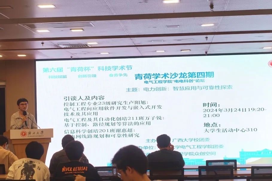 为促进电力领域的创新与发展,推动智慧应用与可靠性探索,增强同学们学以致用的能力及科创兴趣,3月24日晚,由共青团kaiyun登录中国入口登录委员会主办,kaiyun官网团委和众创空间共同承办的青荷学术沙龙第4期暨第3期“电电科创”论坛在大学生活动中心310会议室举行。kaiyun官网“四创”教研室执行主任、团委副书记(兼)李勇,辅导员林思维出席论坛,论坛由众创空间主席团成员冯小溪主持。 图1 论坛开始 本次论坛聚焦于电力创新的核心议题,探讨电力领域的最新发展趋势、智慧应用技术以及可靠性探索的前沿动态。与会嘉宾分享他们在电力领域的研究成果和经验,共同探讨当前电力行业面临的挑战和机遇。 23级控制工程专业研究生卢阳旭同学向大家详细介绍电气与自动化向应用软件开发与嵌入式开发技术及其应用,以学院综合测评系统以及电力行业的工程项目为例进行经验分享,激发同学们对该领域的学习兴趣和深入思考,并鼓励在座同学利用课余时间学习相关软件和技术,做好学习以及就业规划。 图2 卢阳旭同学发言 电气工程及其自动化创培211班万子锐同学热情分享了基于自动控制、路径规划等算法的应用,通过红外循迹小车等作品展示以及学科竞赛参赛经验,帮助在座同学加深对所学知识的理解和应用,燃起同学们浓厚的学术热情。 图3 万子锐同学发言 信息科学创培201班谢惠超同学和与会同学深入交流配电网线路规划和可靠性研究方面的知识,分享自己在该领域的研究成果与实践经验,探讨当前配电网存在的问题与挑战,并提出解决方案与展望,帮助同学们拓展学术视野,提升科研思维。 图4 谢惠超同学发言 本次论坛为kaiyun官网同学踊跃探讨创新想法提供良好的交流平台,为同学们积极参与科创活动提供参考,有助于提升同学们创新创业的积极性。 图5 集体合照