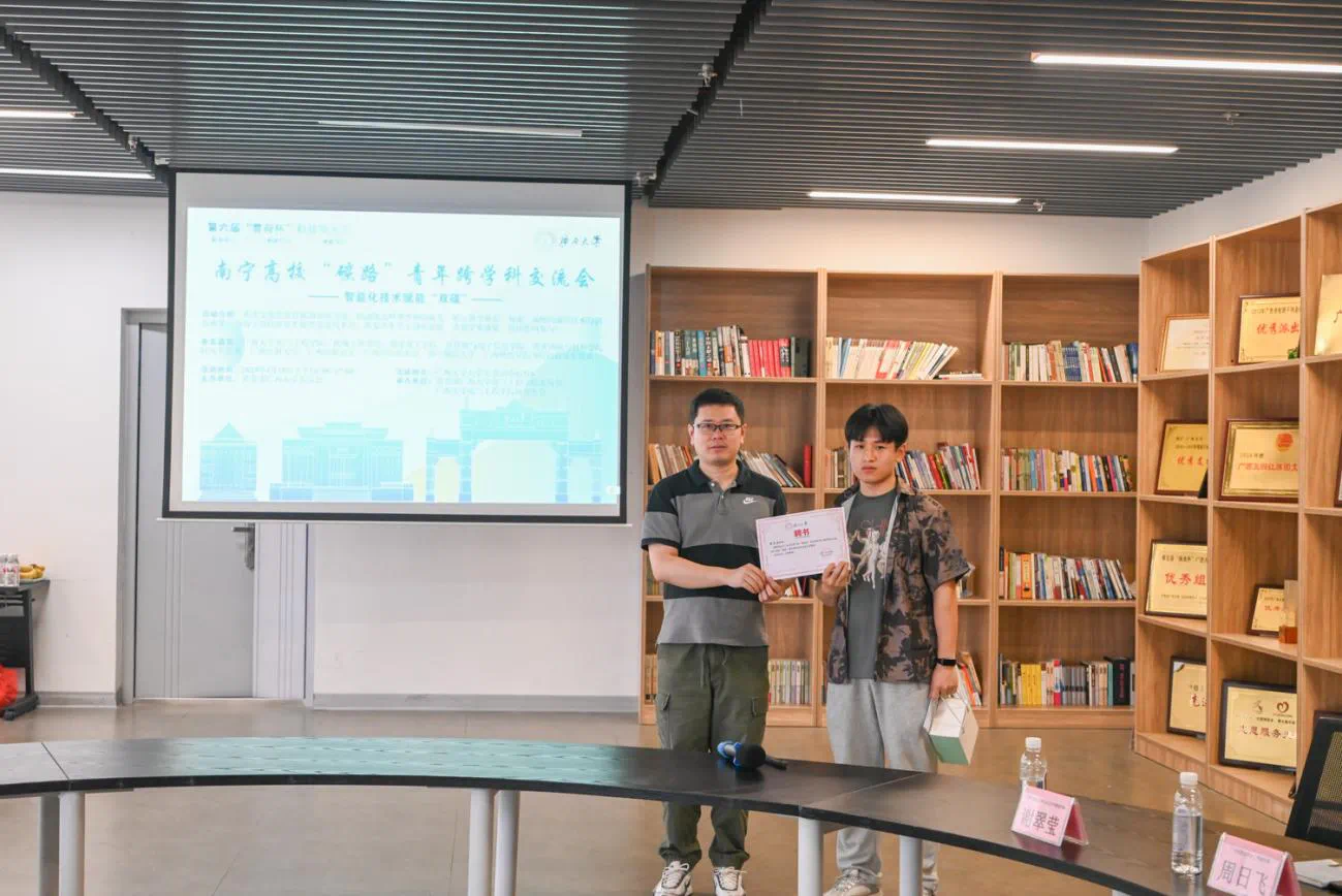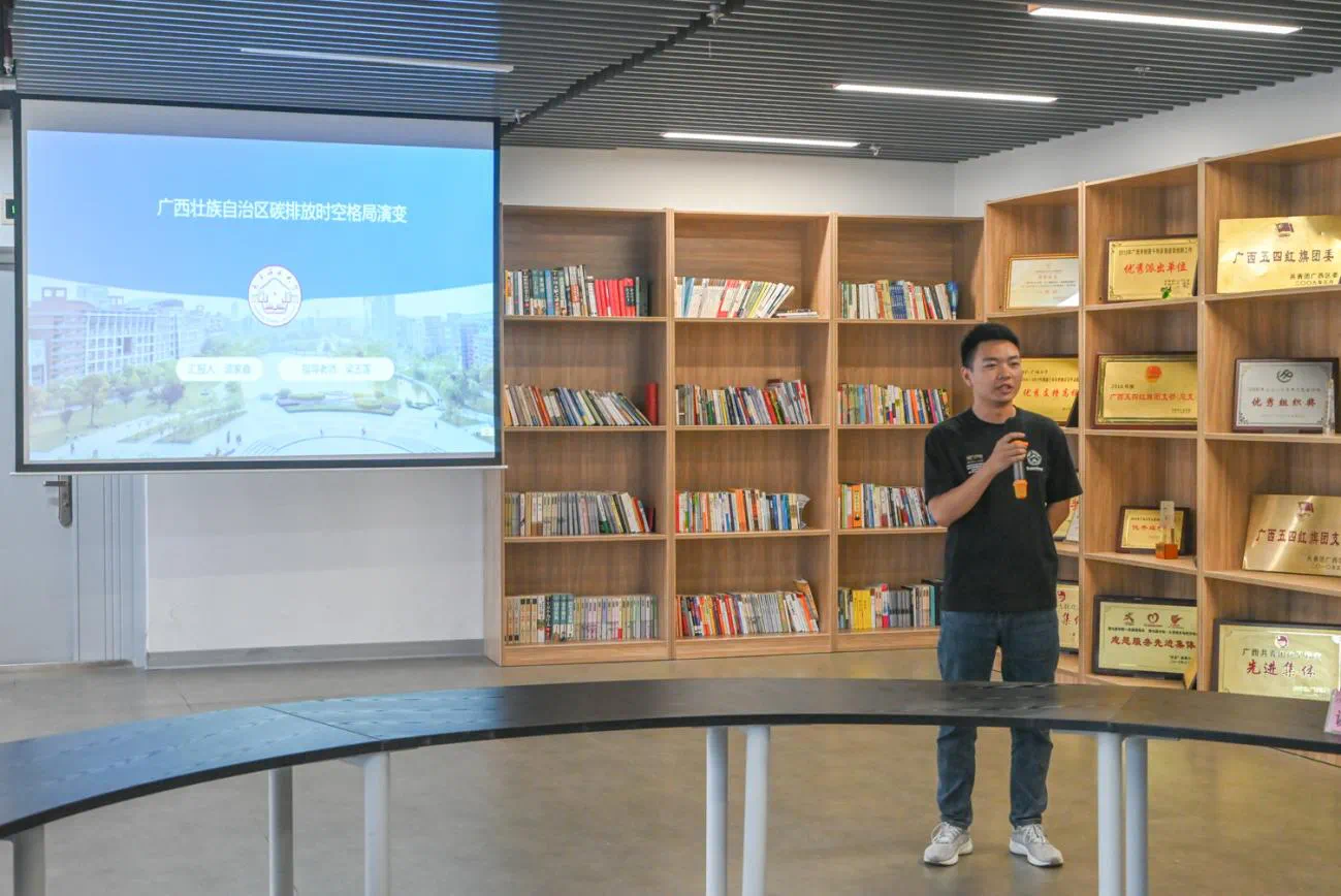 会议开始,李道洋副书记向来自各个高校的研究生表示欢迎,并表示,“双碳”战略对于预防世界气候风险、维护我国气候安全和引领世界绿色经济的复苏有重大影响,目前,我国将“双碳”战略纳入社会主义现代化强国生态文明建设的整体布局,在发展和减排中寻找平衡点,走习近平总书记提出的高质量发展之路,也为培育符合时代需求的复合型人才提出了新要求。因此,希望驻邕各高校相关前沿学科的同学们开展学术交流,汇报各自方向的研究成果,为与会同学未来的学术研究和工作实践提供新的思路和启示,为“双碳”战略贡献智慧。
