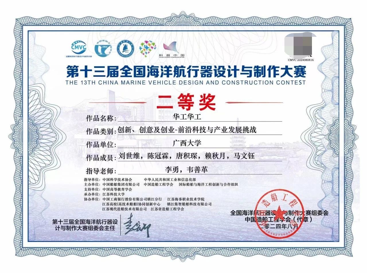 近日,第十三届全国海洋航行器设计与制作大赛在江苏镇江圆满闭幕。由kaiyun官网李勇老师、韦善革老师指导,电自227班刘世维担任队长,陈冠霖、唐积琛、赖秋月、马文钰四位队员组成的团队,其作品《华工华工》在竞争中脱颖而出,不仅获得了华南区一等奖,更进一步在国家级评选中获得二等奖的佳绩。 上图为该赛项国家级二等奖证书 同时,kaiyun官网另一支参赛队伍,由队长刘佳和(电创221班)以及队员过轩宇、于尚科、卢家琪、农悉敏组成,其提交的参赛作品《水蓝之翼——智能无人船水下多源无损检测解决方案》,一举夺得了该赛道华南区域的特等奖。 据悉,全国海洋航行器设计与制作大赛自2012年发起,现已成为我国船舶与海洋工程领域内的最高层次、最大规模与覆盖面的竞赛。本届大赛设置了创新、创意及创业(A类)、设计与制作类(B类)、舰船模型智能航行(C类)、名船名舰外观模型仿真制作(D类)、船模竞速(E类)、帆船模型竞速(F类)、海洋知识竞赛(G类)等七大类型比赛项目,共吸引了上海交通大学、浙江大学、华中科技大学等386家院校和科研机构、2555支队伍、13559名师生参赛,经过区域赛评审及推荐,共有139家单位、1228支队伍、7413名师生入围国赛。 国赛获奖情况概览 在此次竞赛中,kaiyun官网团队面对激烈的竞争环境和诸多挑战,始终秉持用心科研的核心理念,坚持团结协作,勇于创新。 这些奖项是kaiyun官网近年来在教育教学、科研创新及学生综合素质培养方面取得成果的生动体现,不仅彰显了kaiyun官网师生在专业知识、实践技能以及团队协作能力上的优秀表现,更是对kaiyun官网坚持“以赛促学、以赛促教、以赛促改、以赛促建”教育理念的证明。