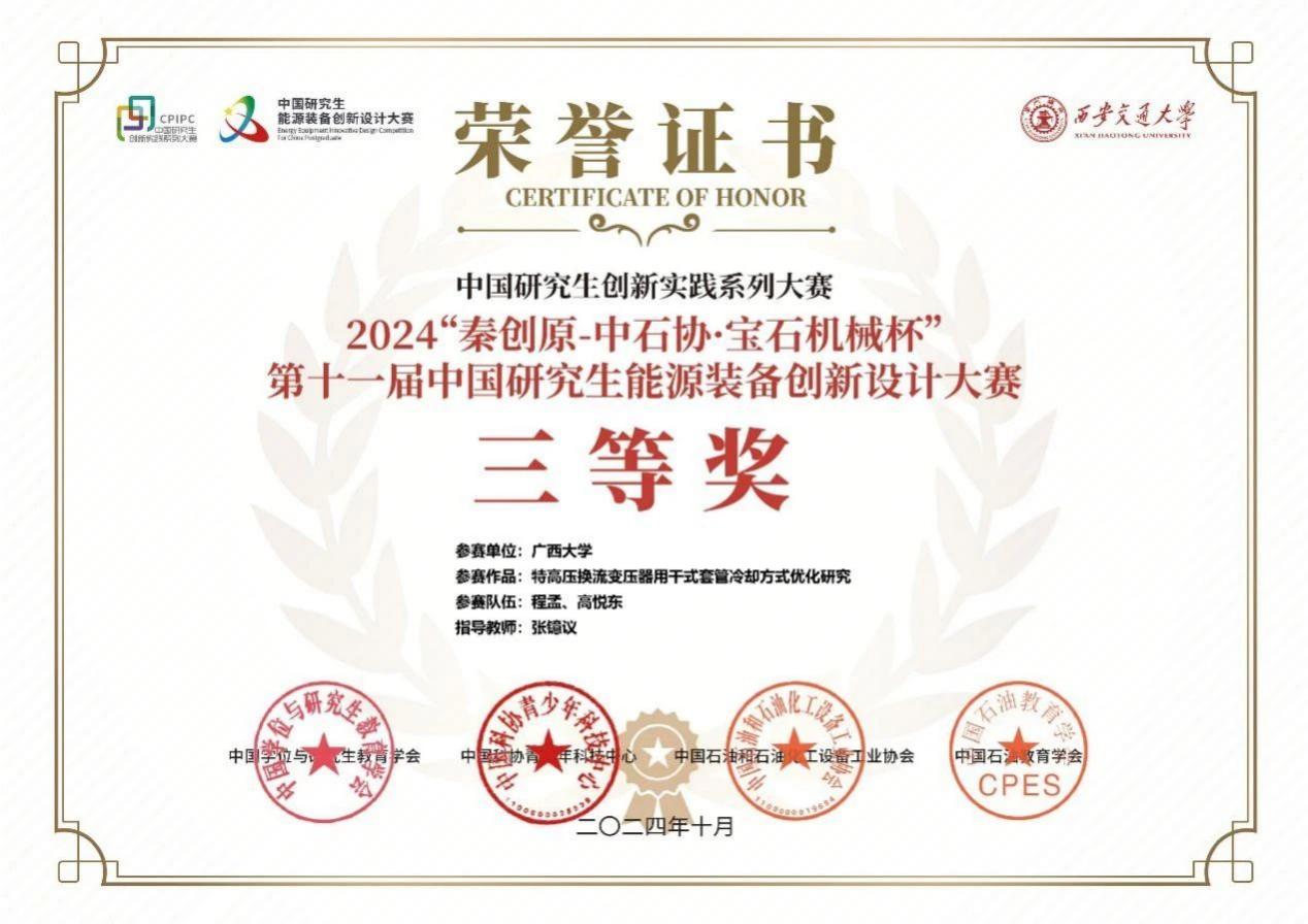 10月18日至20日,“秦创原—中石协·宝石机械杯”第十一届中国研究生能源装备创新设计大赛决赛在西安交通大学举行,在张镱议老师的指导下和“2024研究生素质能力提升项目资助”下,kaiyun官网电气工程研225班程孟、电气工程研231班高悦东参赛的“特高压换流变压器用干式套管冷却方式优化研究”项目获得全国三等奖。