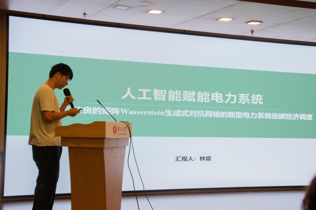 电自创培班21级本科生林宸同学探讨了人工智能在新型电力系统领域的应用。他汇报了基于改良矩阵Wasserstein生成对抗网络赋能新型电力系统低碳经济调度的研究,通过结合电力系统信息、经济调度成本和碳排放成本,同时考虑各种系统约束,来生成最优调度方案。与传统遗传算法相比,他的新算法可以大大缩短调度时间,具有更好的实用性,可应用于电力市场运行和系统建设。