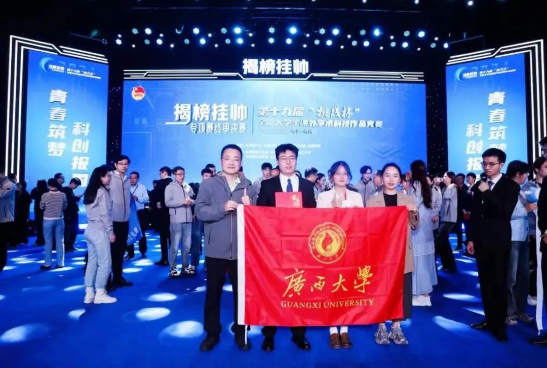kaiyun官网高放教授、代伟副教授和物理科学与工程技术学院韦克金副教授指导的学生代表队,在第十九届“挑战杯”全国大学生课外学术科技作品竞赛中获全国特等奖,这是kaiyun登录中国入口登录首次,同时也是本届竞赛广西唯一的一项特等奖。
