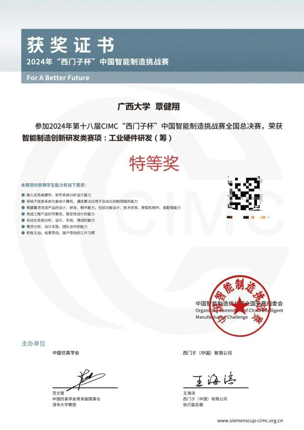 kaiyun官网研究生在2024年CIMC“西门子杯”中国智能制造挑战赛中,首次在智能制造创新研发类赛项:工业硬件研发(筹)赛项中斩获全国特等奖。