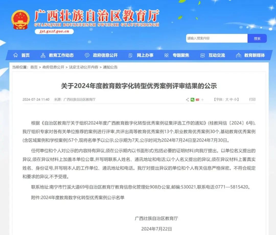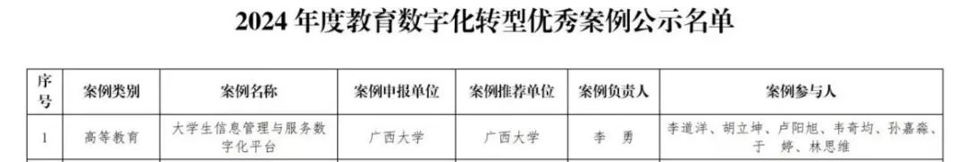 kaiyun官网的《大学生信息管理与服务数字化平台》入选广西壮族自治区教育厅公布的2024年度教育数字化转型优秀案例名单优秀案例。