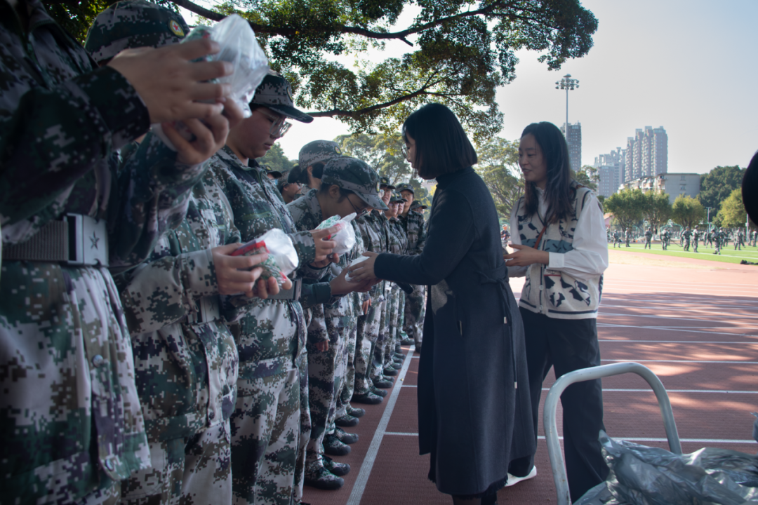 随后,老师和学生骨干们为参训学员送上补给的同时不忘给予鼓励和支持,与同学们亲切互动,为严肃的军训氛围增添一抹暖意。其后,各排排成整齐的队伍,留下了难忘的照片。