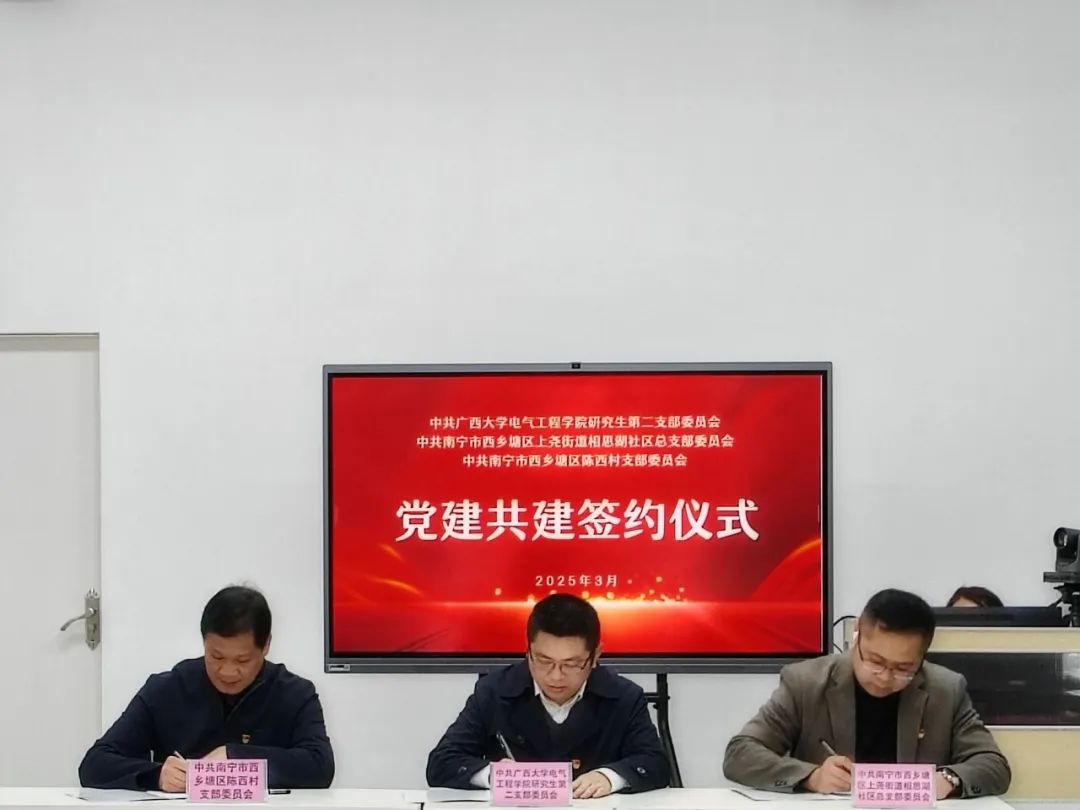 2025年3月5日,kaiyun官网研究生第二党支部(以下简称“电气研二支部”)赴相思湖社区,参加上尧街道举办的“社校联村,服务添能”党建品牌建设会议,与相思湖社区党总支、陈西村党支部签订三方合作共建协议。