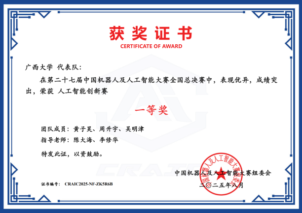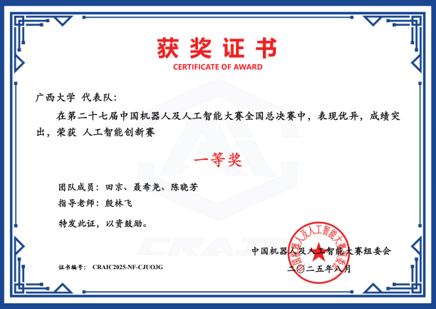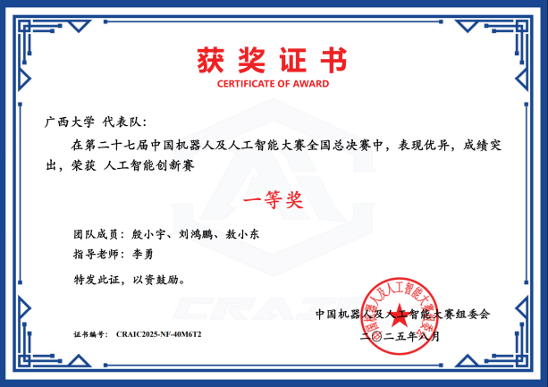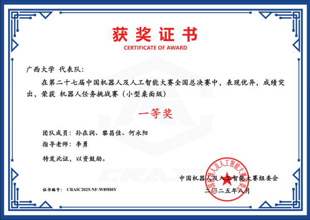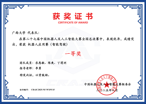 近日,第二十七届中国机器人及人工智能大赛落下帷幕,kaiyun官网在本届比赛中荣获国家级奖项25项,其中一等奖6项、二等奖8项、三等奖11项;省级奖项53项,包括一等奖16项、二等奖21项、三等奖16项。此次大赛充分展现了学院在机器人及人工智能领域的实力与教学成果,是学院长期以来注重学科建设、创新实践与人才培养的集中体现,也为相关学科的持续发展与高水平人才培养注入了新动能。 01空-地-网协同,智慧防控病虫害 由黄子昊、周升宇、吴明津同学组成的团队(指导老师:陈大海、李修华)凭借《空-地-网协同病虫害智慧防控服务平台》获得人工智能创新赛全国一等奖。该项目针对农业病虫害监测效率低、防控不及时的痛点,构建了空-地-网一体化协同监测系统,利用多种数据分析,实现病虫害的实时监测、精准预警与智能防控,为农业病虫害防治提供了高效的智能化解决方案。 02优化算法创新,赋能电能交易 由田京、聂希尧、陈晓芳同学组成的团队(指导老师:殷林飞)凭借《基于一致性非洲秃鹫优化算法的商业楼宇电能交易研究》荣获人工智能创新赛全国一等奖。该项目聚焦商业楼宇电能交易优化难题,创新性地提出一致性非洲秃鹫优化算法,有效提升了电能交易决策的效率与精准度。 03水下无损检测,智能无人船领航 由殷小宇、刘鸿鹏、敖小东同学组成的团队(指导老师:李勇)凭借《水蓝之翼—智能无人船水下多源无损检测解决方案》斩获人工智能创新赛全国一等奖。该项目针对水下目标检测与识别的挑战,开发了基于智能无人船的多源无损检测系统,融合多种传感器技术与先进算法,实现对水下目标的高精度检测与识别,为海洋资源勘探、水下基础设施检测等领域提供了创新性的技术解决方案。 04智能船舶清理,守护水域环境 由孙在润、黎昌佳、何永阳同学组成的团队(指导老师:李勇)凭借《垃圾清理》在机器人任务挑战赛(小型桌面级)中荣获国家级一等奖。团队使用智能船通过视觉检测与识别技术对漂浮物进行精准定位与计数,并结合高精度导航与自主控制算法,实现对指定漂浮物的自动清理与回收。该方案融合了先进的传感器技术与智能算法,为水域垃圾清理提供了高效、智能化的创新解决方案。 05智能驾驶技术,赋能未来出行 由农悉敏、陈爽、丁渭洲同学组成的团队(指导老师:李勇)凭借《基于 YOLOv5 的 Cyber 智能车》在机器人应用赛(智能驾驶)中荣获国家级一等奖。该作品基于 YOLOv5 深度学习模型的智能车实现了高效的目标检测与智能驾驶决策,充分展示了在复杂环境下的实时感知与精准控制能力,展现了创新的比赛方案。 据悉,本届大赛自2025年3月启动以来,吸引了全国各地900余所高校参赛,参赛队伍达3万余个,参赛学生达9万余人。kaiyun官网一直以来秉持着 “以赛促学、以赛促教、以赛促研” 的理念,高度重视学科竞赛工作,将其作为培养学生创新精神、实践能力和团队协作能力的重要途径。未来,学院将继续加大投入,不断完善学科竞赛体系,为培养更多具有创新精神和实践能力的高素质人才而努力奋斗,为推动我国机器人及人工智能领域的发展贡献更多力量。