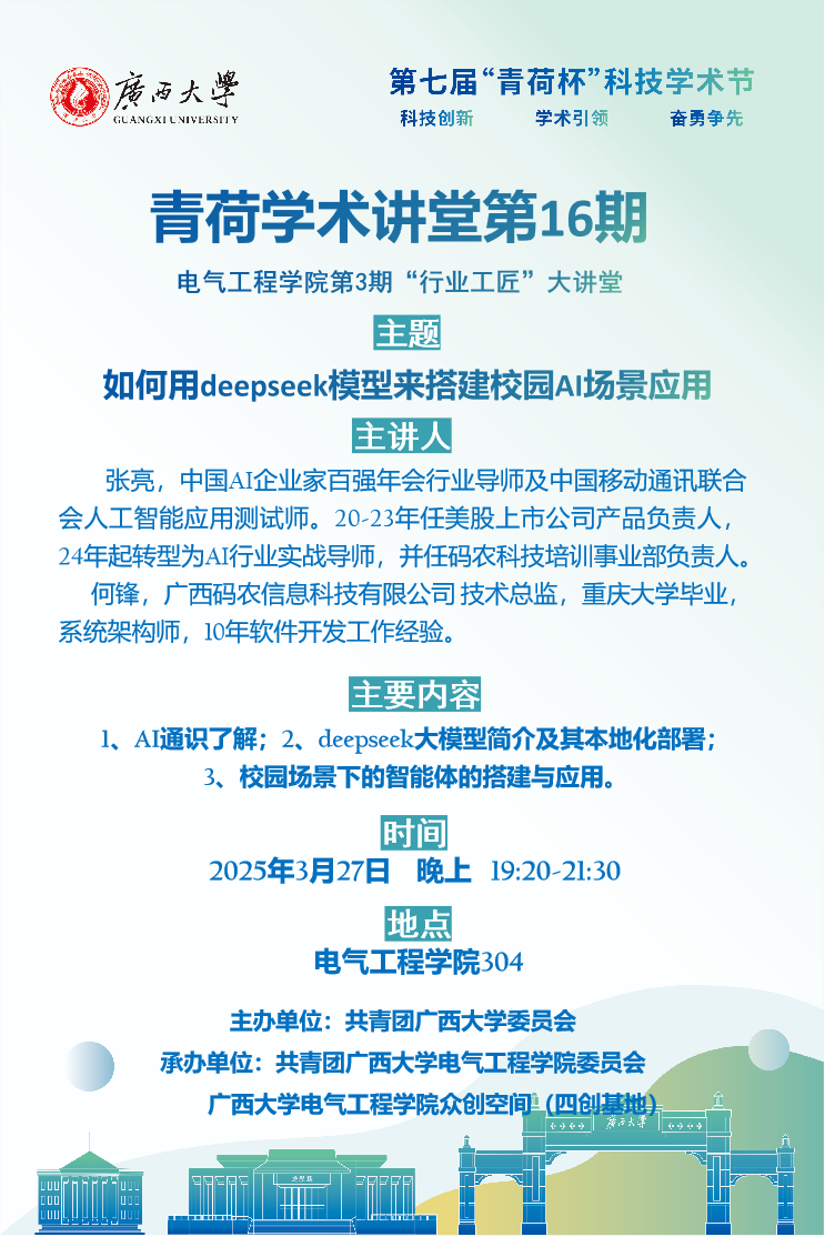 人工智能是当前的热点,deepseek也在各行各业展开了广泛应用!第七届“青荷杯”科技学术节之青荷学术讲堂第16期如期而至!这一次,我们以“如何用deepseek模型来搭建校园AI场景应用”为主题,邀你踏上探索deepseek校园场景应用的奇妙旅程。这不仅是一次知识的盛宴,更是一场理论与实践的深度融合!在与行业专家面对面交流、深入探讨的过程中,见证AI和deepseek模型的无限潜力,点燃内心对这一前沿领域的探索热情。当实验室大门为你敞开,科学的奥秘触手可及!