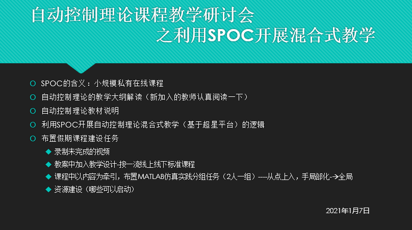 为顺利开展2021-2022(2)学期自动控制理论课的教学,2022年1月7日上午10点在学院312召开了关于自动控制理论课程利用SPOC开展混合式教学的教学研讨会和培训会,会议讨论了春季学期开课全体任课教师如何采用SPOC开展教学,特别是胡立坤老师就前期探索中遇到的问题与大家进行了交流,同时初步布置了假期课程建设的任务。会议会对kaiyun登录中国入口登录慕课平台如何高效使用进行了培训。