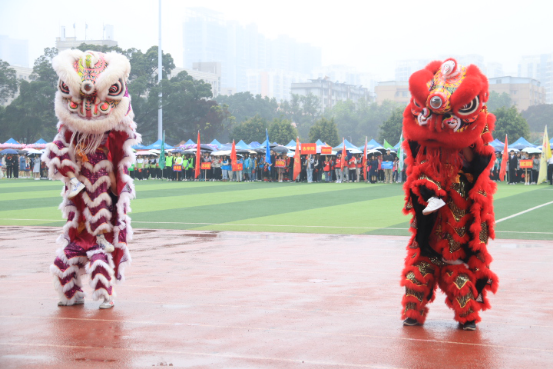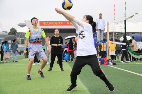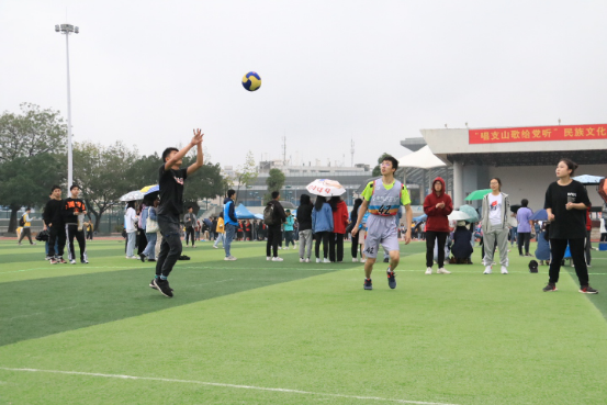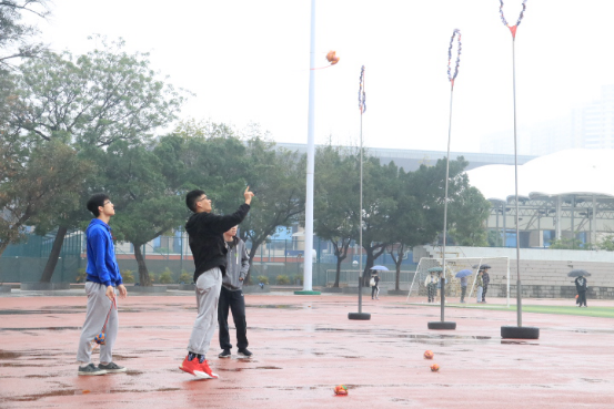 雨天,篮球场的地面潮湿,但是仍然阻止不了同学们参与活动的热情。