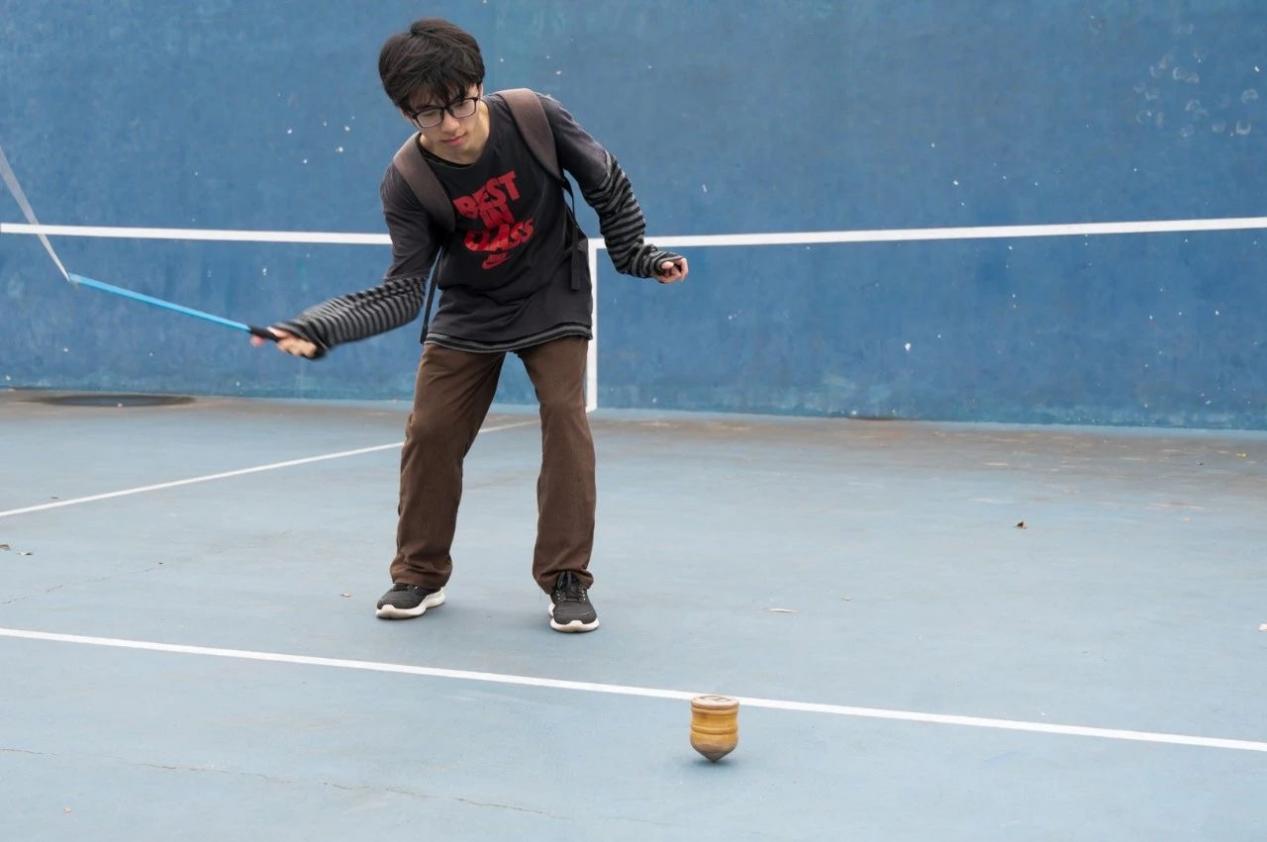 打陀螺比赛上,参赛队员将皮筋缠好陀螺,手臂一挥,陀螺随即旋转,每一次为陀螺加速而进行的挥鞭,都会与大地接触,谱写响亮的乐章。