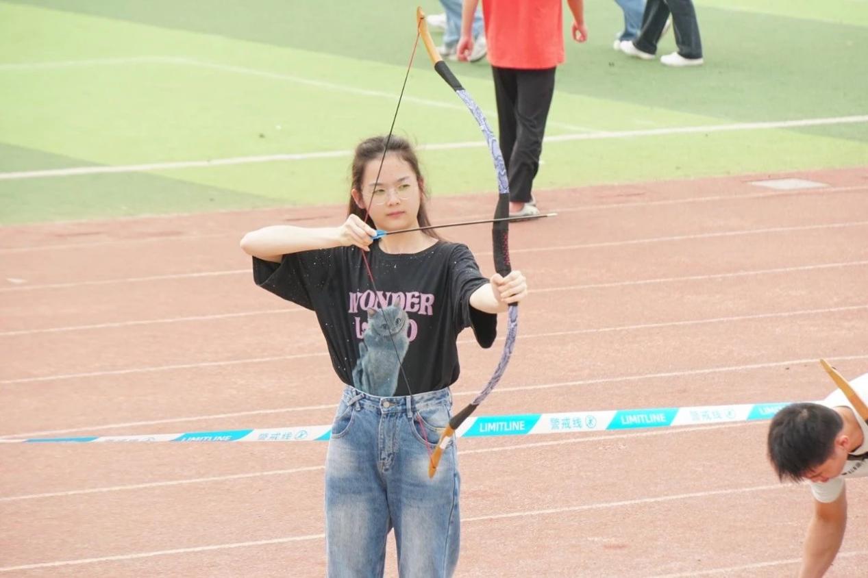 射箭比赛中,选手目光如炯,箭指靶心,刹那射出,正中靶心。