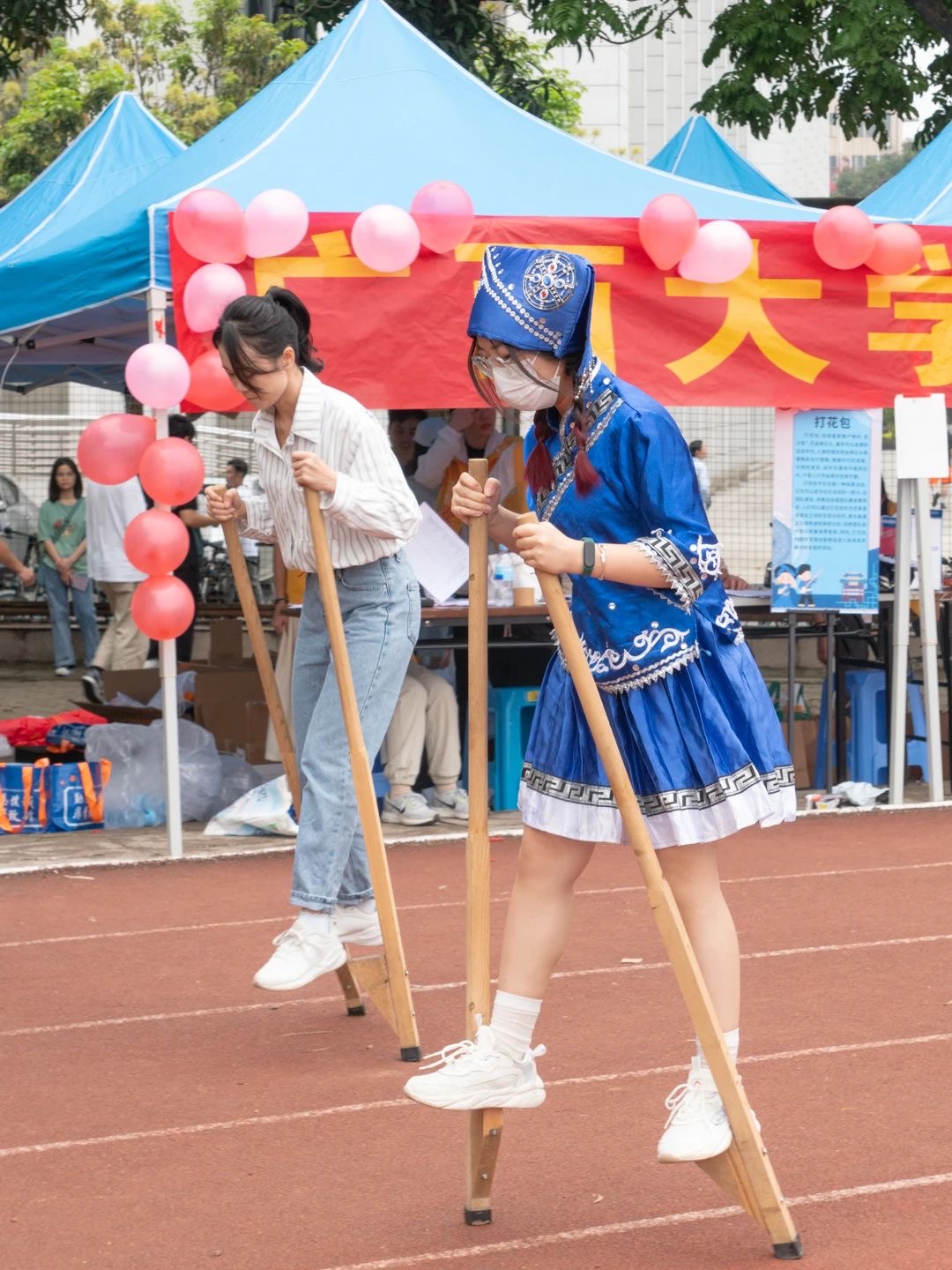高脚马比赛上,同学们学习前面选手的动作,在“高脚马”上努力保持平衡,克服摔倒的恐惧,向终点奋力迈去。