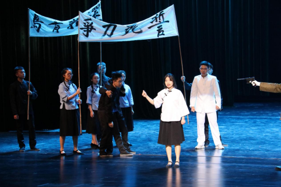 A:我们这个话剧是根据网络上的话剧改编而来的,把话剧中的历史故事与现实中的事情相结合,体现出历史事件对同学们的思想启发。