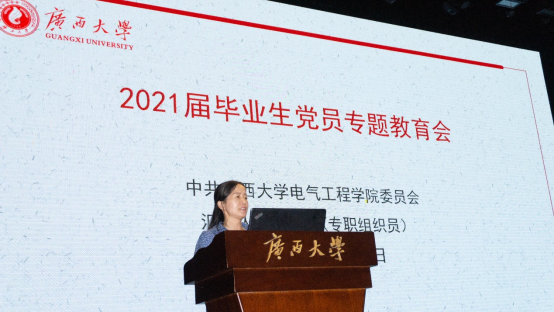 最后,学院党委组织委员廖碧莲老师为毕业生党员讲解毕业学期的党员工作及党组织关系的转移。廖老师根据发展党员过程中的不同身份,对党员档案材料的归档、书写要求、时间节点等进行了重点的讲解。廖老师寄语同学们要坚持学习,保持清正廉洁,加强党性修养,牢记党员的光荣和使命,在新的人生征途上再创辉煌。