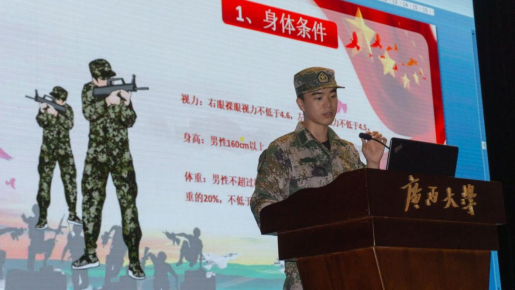 首先,武装部军政科陈榕平老师和退伍大学生代表赵星宇、卓义雄同学进行征兵宣讲。陈老师结合现代化强军建设对高水平人才的需求,对同学们就业选择进行精准指导,鼓励大家积极参军入伍,为国奉献青春。学生代表介绍了征兵入伍条件及要求,并结合亲身经历介绍军营生活、优待政策等。