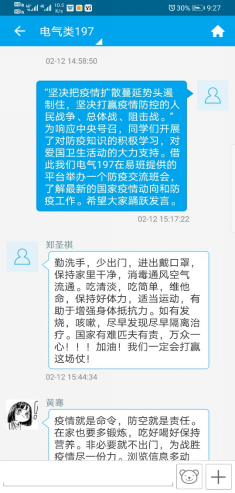 电气197班:同学们通过在易班等社交平台表达了对于此次学习的思想感悟以及互相积极鼓励学习先进知识,交流了抗疫的小知识与实时的疫情防控信息。做到第一自己坚守阵地自我保护不为抗疫添乱,其次积极为朋友和家人传播正确的抗疫斗争思想,做到力所能及地为中国抗疫添一份自己的力量