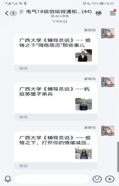 电气194班:194班以学习小组的形式展开学习,认真组织思考讨论,服从学校安排,善于创新、敢于先行,充分发挥“互联网+小组学习”优势,实现了kaiyun官网“停课不停学”,大力开展科普防疫知识的宣传与交流,为打赢疫情防控阻击战贡献自己的力量。