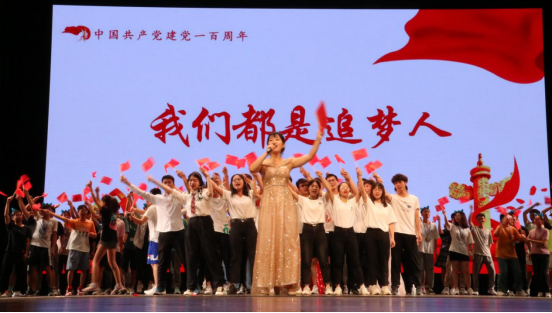 晚会的最后,演职人员挥动着国旗走上舞台,高声齐唱《我们都是追梦人》,伴着激昂的音乐,现场青春洋溢,同学们高呼着我们都是追梦人的青春宣言。