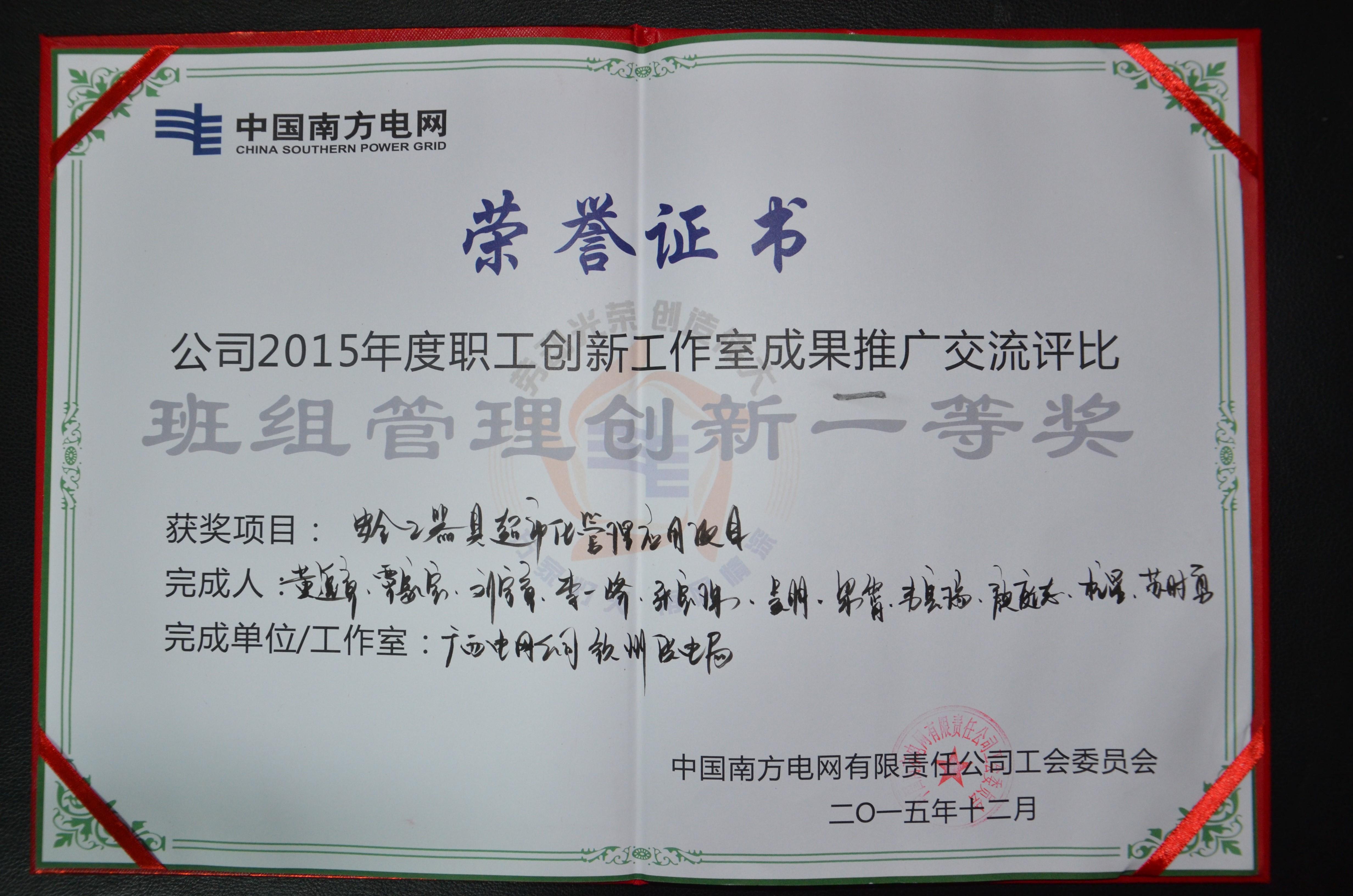 黄逸章研发的安全工器具系统达到了操作简易、效果实用、部署经济、工作高效快速特点,得到了班组同事的一致好评和领导认可,在2015年钦州供电局职工创新项目报告演示中荣获了三等奖。