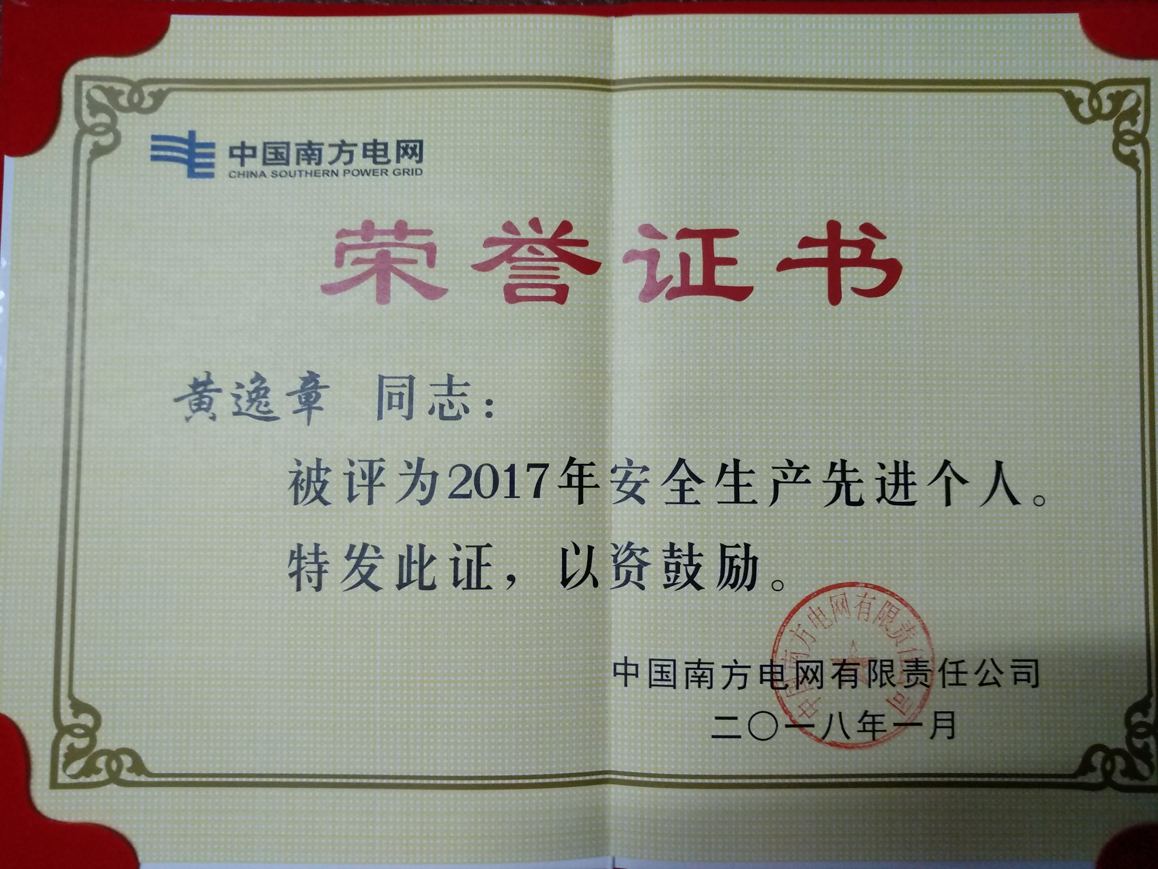 辛勤的工作付出,得到了上级领导肯定,黄逸章连续于2015、2016、2017年荣获了灵山供电公司生产工作标兵称号、2017年钦州市五四青年奖章和南方电网公司2017年安全生产先进个人等荣誉称号。