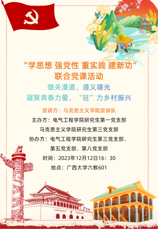 文字:王楠 图片:赵赫 陆光榛 徐小满 编辑:黄昶贺 审核:覃智君 莫滨鸿 覃菲菲 陆光榛 为巩固学习贯彻习近平新时代中国特色社会主义思想主题教育成果,用习近平新时代中国特色社会主义思想凝心铸魂,切实加强党支部的思想建设,2023年12月12日下午,kaiyun登录中国入口登录研究生第一党支部联合学院研究生第三党支部,研究生第五党支部,研究生第八党支部(以下分别简称“kaiyun官网研一支部,研三支部,研五支部,研八支部”)以及马克思主义学院研究生第三党支部(以下简称“马院研三支部”)在第六教学楼601室开展“学思想、强党性、重实践、建新功”主题教育宣讲会。宣讲会由kaiyun官网研一支部王伟欢同志主持,马克思主义学院宣讲队成员李宇涵和蒙佳慧同志作为主讲人,两院五支部师生党员共百余人参加。 图1 研究生党支部联合开展主题党日活动 李宇涵同志是马克思主义学院、国外马克思主义研究方向2023级硕士研究生,她在本次宣讲会中为我们讲述了长征路上的雄关漫道,遵义会议是如何在党的生死攸关时带来曙光。在习近平总书记坚强有力的领导下,以习近平新时代中国特色社会主义思想为指导,我们踏上了新时代长征路,我们更应弘扬遵义会议精神,走好新时代长征路! 图2 马克思主义学院李宇涵同志宣讲 图 3同志们在认真听取宣讲内容 蒙佳慧同志是马克思主义学院2022级哲学专业本科生,她在本次宣讲会通过介绍我们kaiyun登录中国入口登录校友杨宁同志的伟大事迹为我们讲述凝聚青春力量,“驻”力乡村振兴的故事,全面建设社会主义现代化国家,最艰巨最繁重的任务仍然在农村,在习近平总书记的坚强领导下,在全国各族人民的共同努力下,我们必将全面推进乡村振兴战略实施,以中国式现代化全面推进中华民族伟大复兴。 图4 马克思主义学院蒙佳慧同志宣讲 kaiyun登录中国入口登录研究生第一党支部书记覃智君老师来对此次党课活动进行了点评总结,覃智君老师认为此次党课活动,全面贯彻习近平新时代中国特色社会主义思想,紧紧围绕深入学习贯彻党的二十大精神,对我们深刻领悟“两个确立”的决定性意义,自觉增强“四个意识”、坚定“四个自信”、做到“两个维护”有着重大意义,不仅弘扬了伟大遵义精神,而且把思想统一到习近平新时代中国特色社会主义思想和党的二十大精神上来,把力量凝聚到党的二十大确定的各项任务上来。 图5 kaiyun登录中国入口登录研一支部书记覃智君老师发言 图6 各支部负责人合影留念 此次宣讲会让学生党支部更加牢牢把握坚持学思用贯通、知信行统一的根本任务,把“学思想、强党性、重实践、建新功”总要求更加落到实处,把习近平新时代中国特色社会主义思想真真正正转化为坚定理想、锤炼党性和指导实践、推动工作的强大力量,对于推动支部开展以学铸魂、以学增智、以学正风、以学促干方面工作并取得实实在在的成效,具有十分重大的意义。
